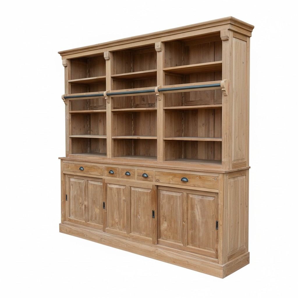 Deze brede boekenkast combineert veel opbergruimte met een karaktervolle uitstraling. Met een breedte van 260 cm en een hoogte van 230 cm is de kast ideaal voor grote woonkamers, werkkamers of kantoorruimtes waar zowel functionaliteit als uitstraling belangrijk zijn.
