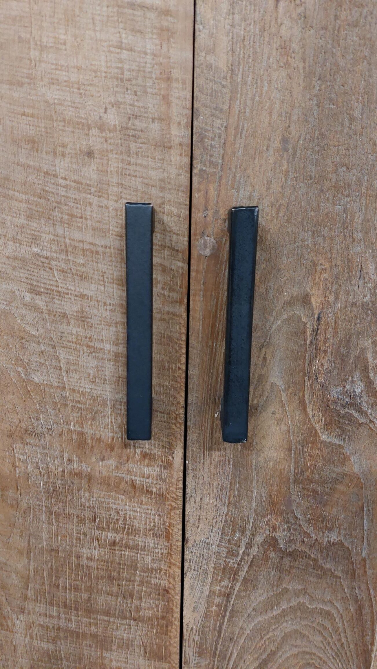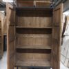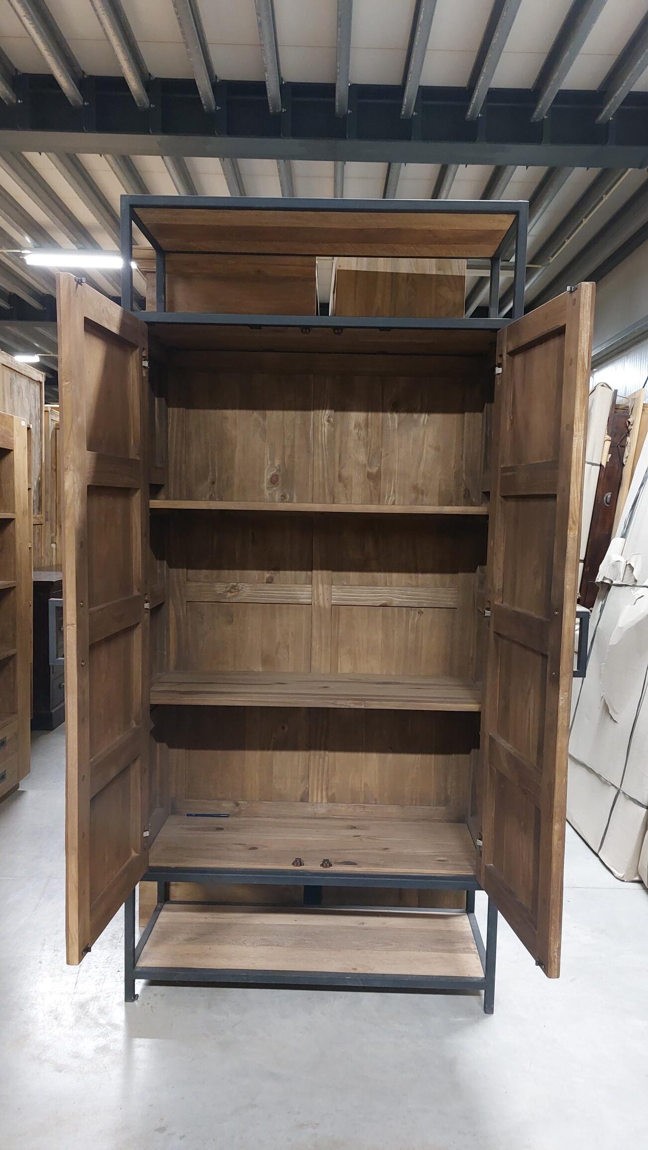 Deze industriele bergkast is 100cm breed, 40cm diep en 210cm hoog. Achter de twee dichte deuren is veel bergruimte. Boven en onder de deuren zijn nog extra schappen gemaakt.