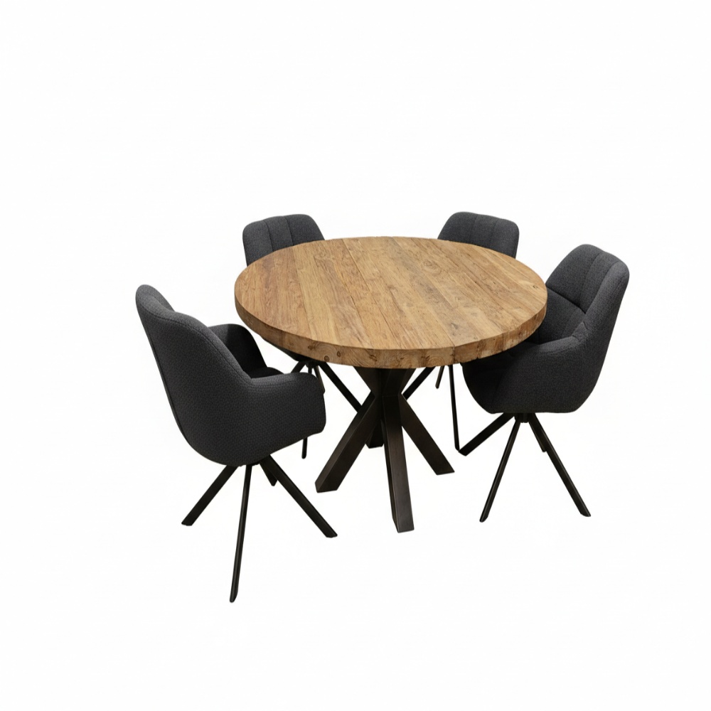 Deze ronde eettafel combineert een warm massief blad met een stoere industriële poot. De ronde vorm zorgt voor een gezellige setting waarin iedereen elkaar makkelijk aankijkt.